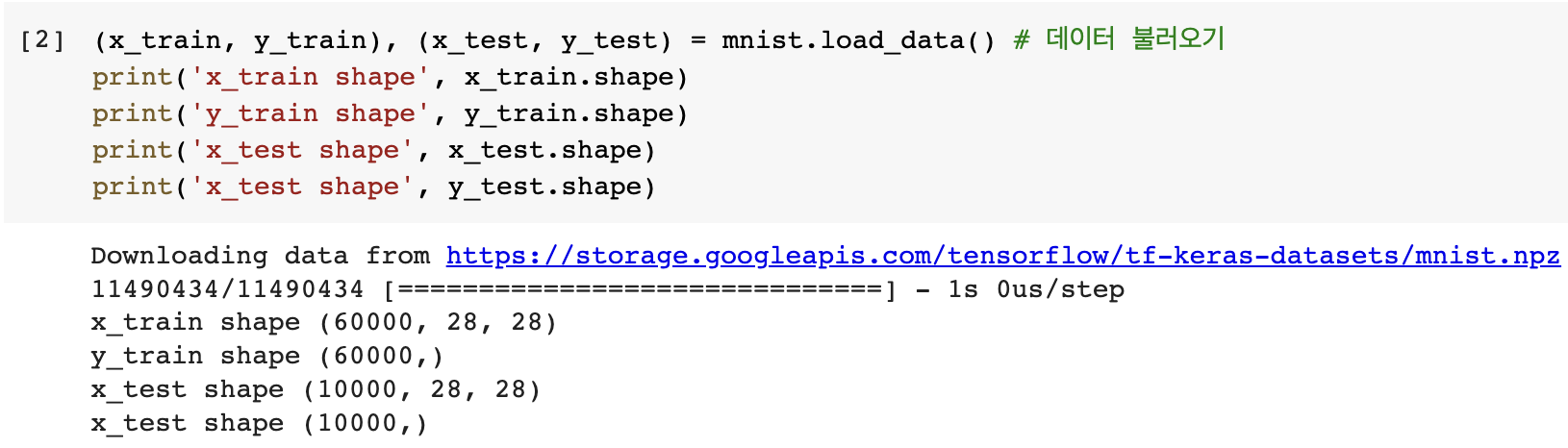 코드 실행 결과: x_test shape (10000, 28, 28)