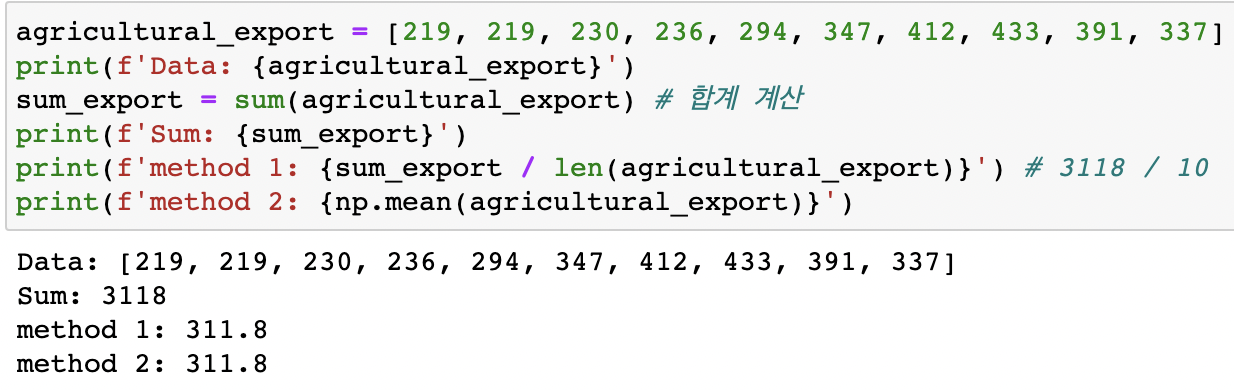 | example 미 농무성에서 조사한 자료에 의하면 1974년에서 1983년까지 미국의 연간 농산물 수출액은 219, 219, 230, 236, 294, 347, 412, 433, 391, 337억 불이었다. 이 기간 동안 미국의 연간 농산물 수출액의 평균을 구하시오. 파이썬 실습 ![]() |