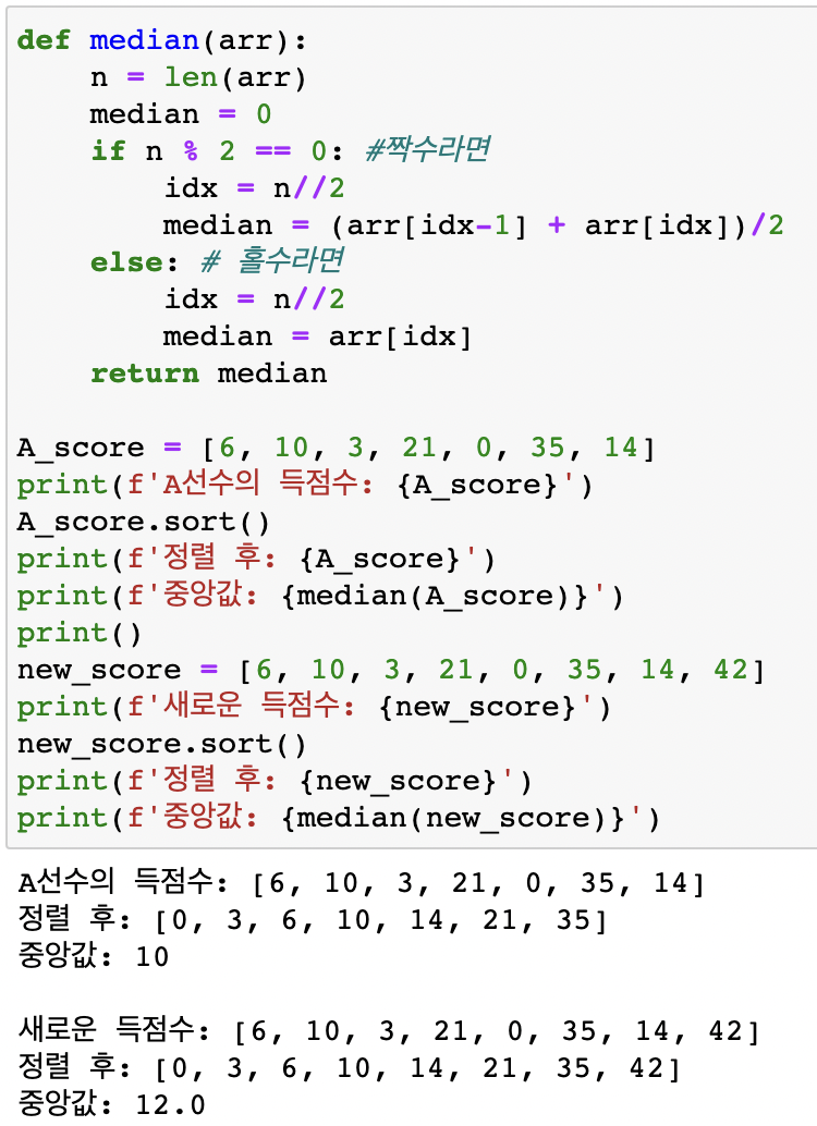 | 중앙값(median) | 전체 데이터를 크기 순서대로 나열했을 때 정중앙에 위치한 수 |