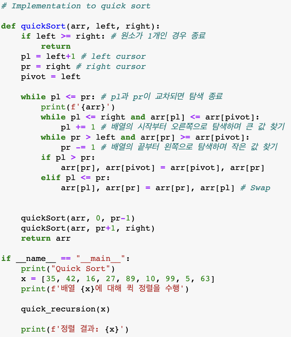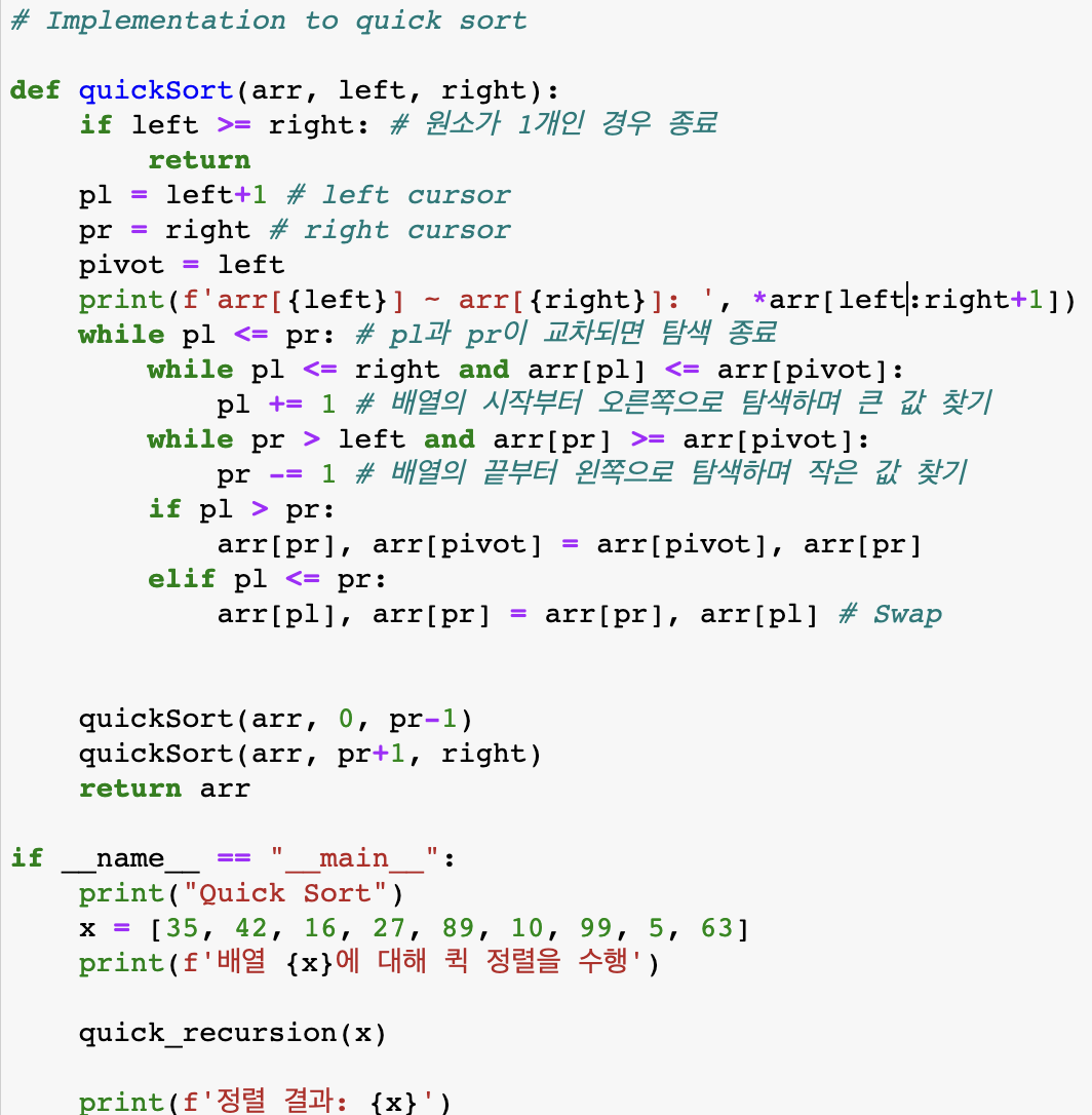 pl이 pr보다 왼쪽에 있을 경우, 두 개의 data를 swap한다. 이 과정을 반복하며 pl이 pr보다 오른쪽에 있을 경우, 즉 pl과 pr이 교차하는 경우 pr(작은 값)과 피벗을 swap한다. 이렇게 swap된 피벗은 해당 위치에 fix되며 피벗을 기준으로 왼쪽과 오른쪽으로 그룹을 나누어 해당 과정을 반복한다. 마지막으로 전체를 결합하면 정렬된 배열이 완성된다.