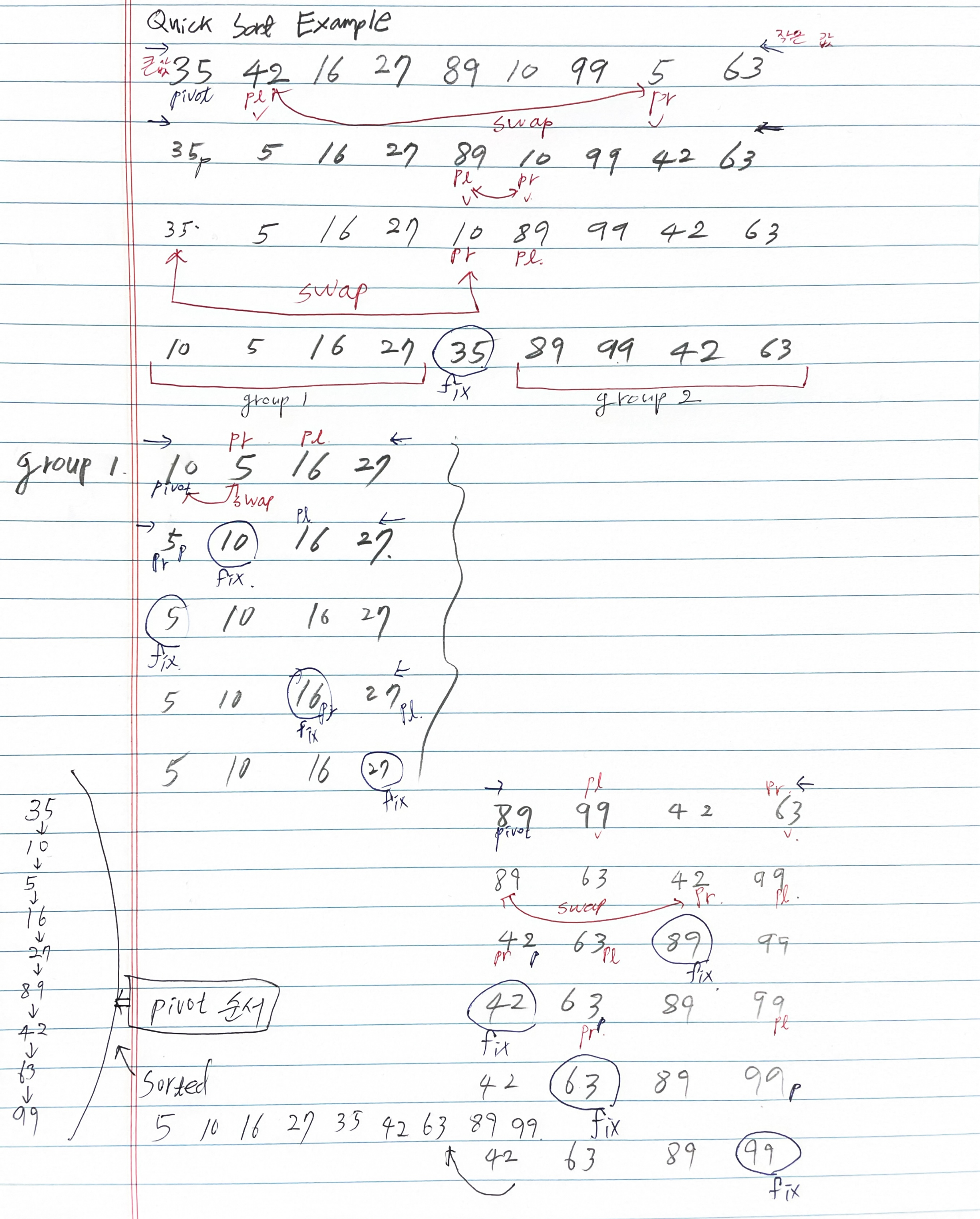 Q. [35, 42, 16, 27, 89, 10, 99, 5, 63] 와 같이 데이터가 있을 때 퀵 정렬을 이용해 정렬하고 피벗의 순서를 작성해보자.