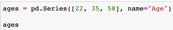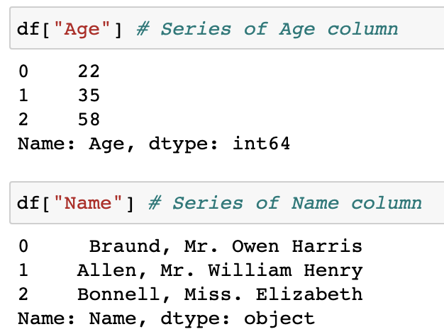 앞서 우리는 Name, Age, Sex라는 헤더 값을 가진 각각의 열이 있었다. 이때 Age의 열에 대해서 살펴보면 df["Age"]를 입력하여 접근할 수 있다. 이때 출력되는 열의 데이터들을 시리즈(Series)라고 한다.