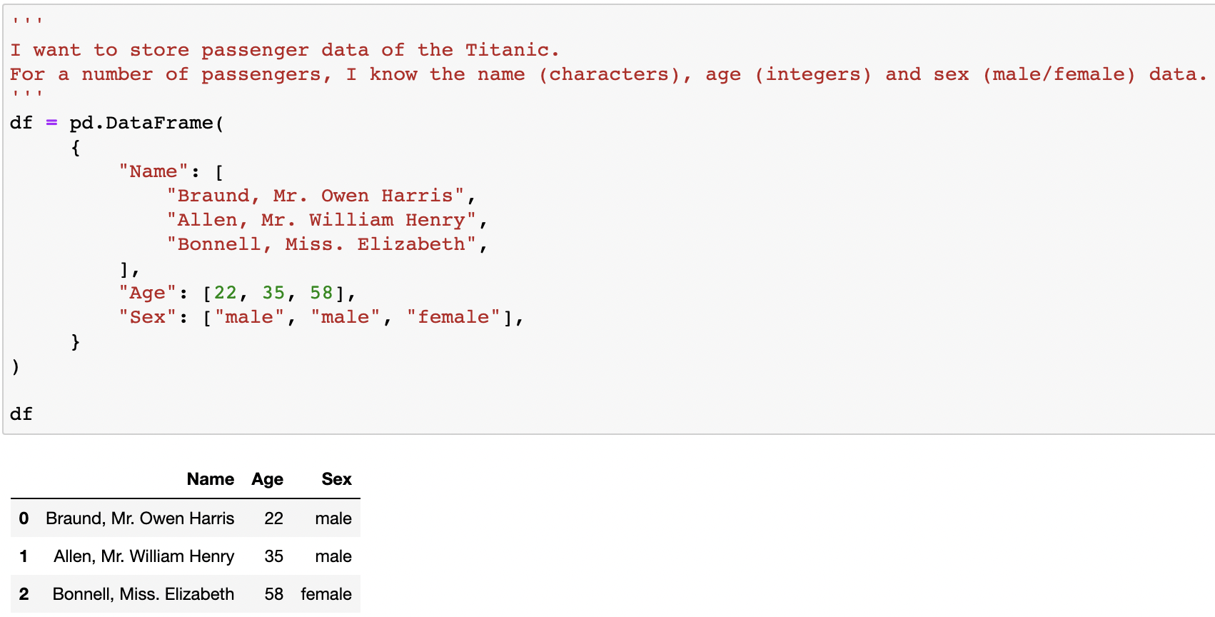 이 예제에서는 파이썬의 딕셔너리를 사용해서 데이터프레임을 생성하였는데, 각 dictionary의 key값은 열의 헤더값(ex: Name, Age, Sex)으로 사용되고, value 값은 각 열의 데이터 값이 된다.