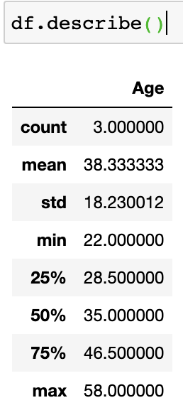 참고로 필자가 앞서 생성한 데이터프레임(df)의 열은 Name 시리즈, Age 시리즈, Sex 시리즈로 구성되어 있으나 describe() 함수로 기초적인 통계량을 출력할 때에는 Age 시리즈만 대상으로 출력 되었는데, 앞서 설명한 것과 같이 수치형 자료에 한해서만 출력되기 때문이다.