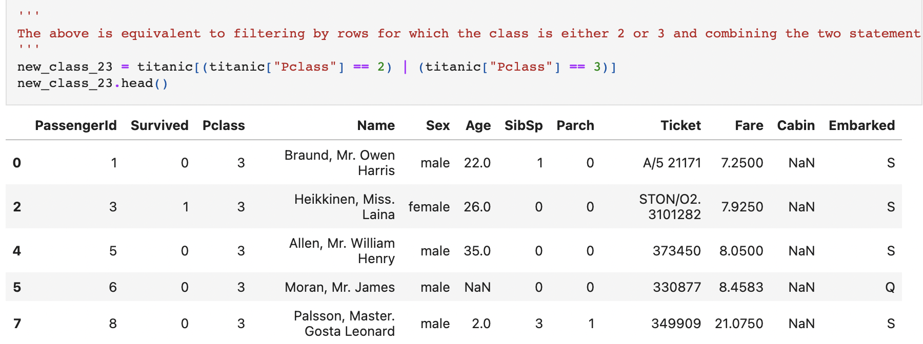 그래서 만약 타이타닉 데이터 중에서 2 클래스와 3 클래스에 탑승한 데이터프레임을 추출하고자 한다면 아래와 같다.