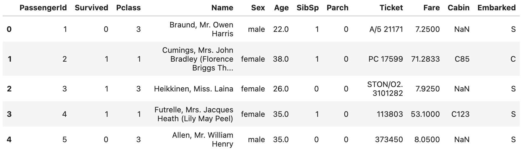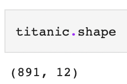 이 데이터의 전체 행과 열의 갯수가 궁금하면 titanic.shape로 알아볼 수 있다.
