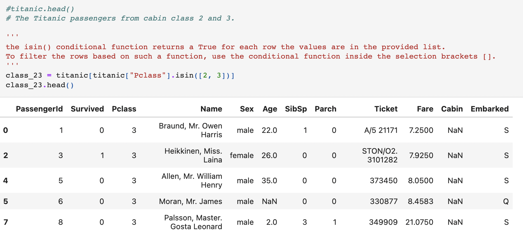 만약, titanic["Pclass"].isin([2, 3])라고 한다면 Pclass 열에 해당하는 행 데이터들 중 2와 3인 값들만 True를 반환하고 나머지는 False를 반환하게 된다.