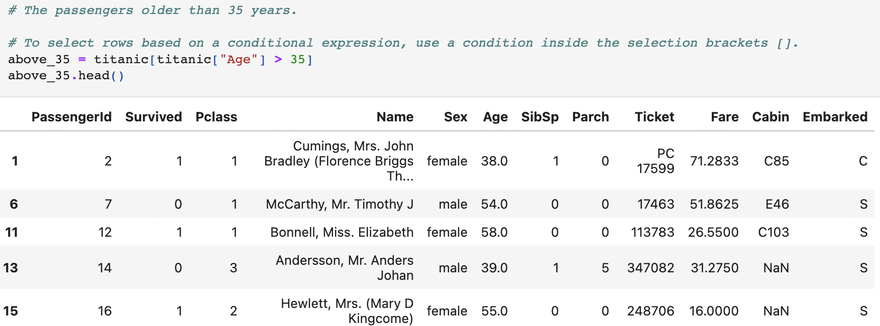 예를 들면 타이타닉 데이터에서 나이가 35살을 초과하는 경우만 추출하고 싶을 경우에는 어떻게 할까?