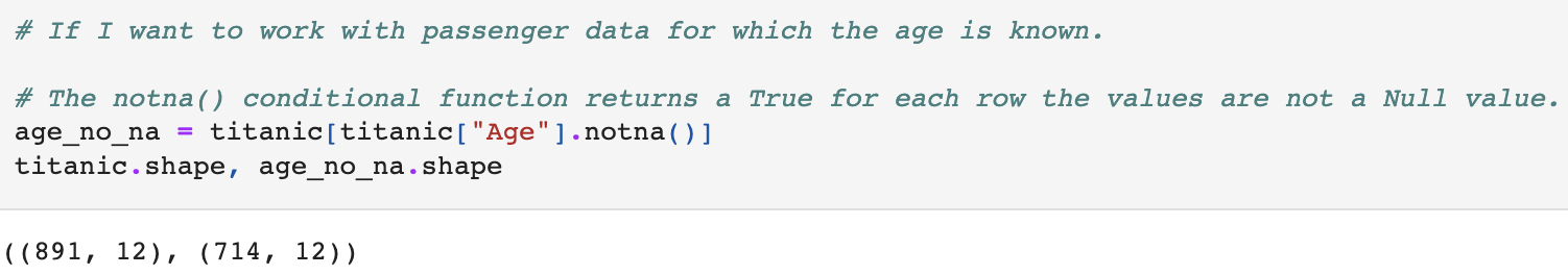 예를 들어 titanic["Age"].notna()를 해주면 나이에 해당하는 시리즈 값들 중 결측치가 아닌 값만 True로 반환된다.