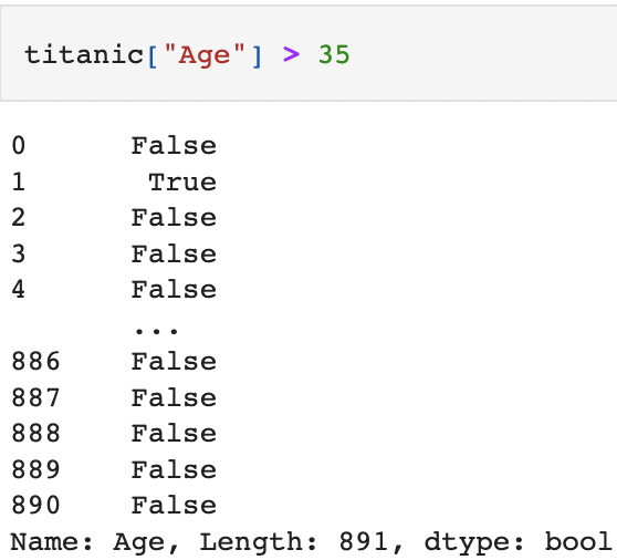 이렇게하면 시리즈의 값들이 모두 boolean형으로 바뀌고 만약 35를 넘는 값인 경우 True를, 이하인 값들은 False를 반환하게 된다.