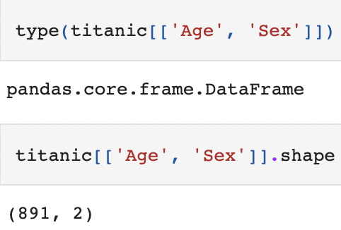 그렇다. 하나의 시리즈만 추출할 경우 []를 하나만 사용하고, 두 개 이상의 시리즈를 추출할 경우에는 이미 있는 [] 대괄호 안에 다시 []를 사용해 열이름을 리스트 형태로 넣어서 추출해야 한다. 이 경우는 시리즈가 추출이 되는걸까? 아니다. 이 경우는 시리즈로 이루어진 데이터프레임이 출력된다. 타입(type)과 형태(shape)를 확인해보자.