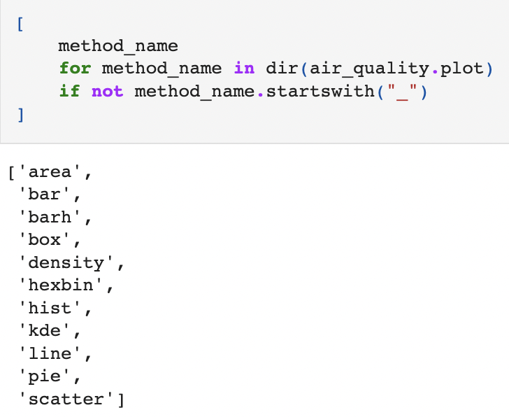area, bar, barh, box, density, hexbin, hist, kde, line, pie, scatter 등 다양한 메서드가 존재함을 확인할 수 있다.