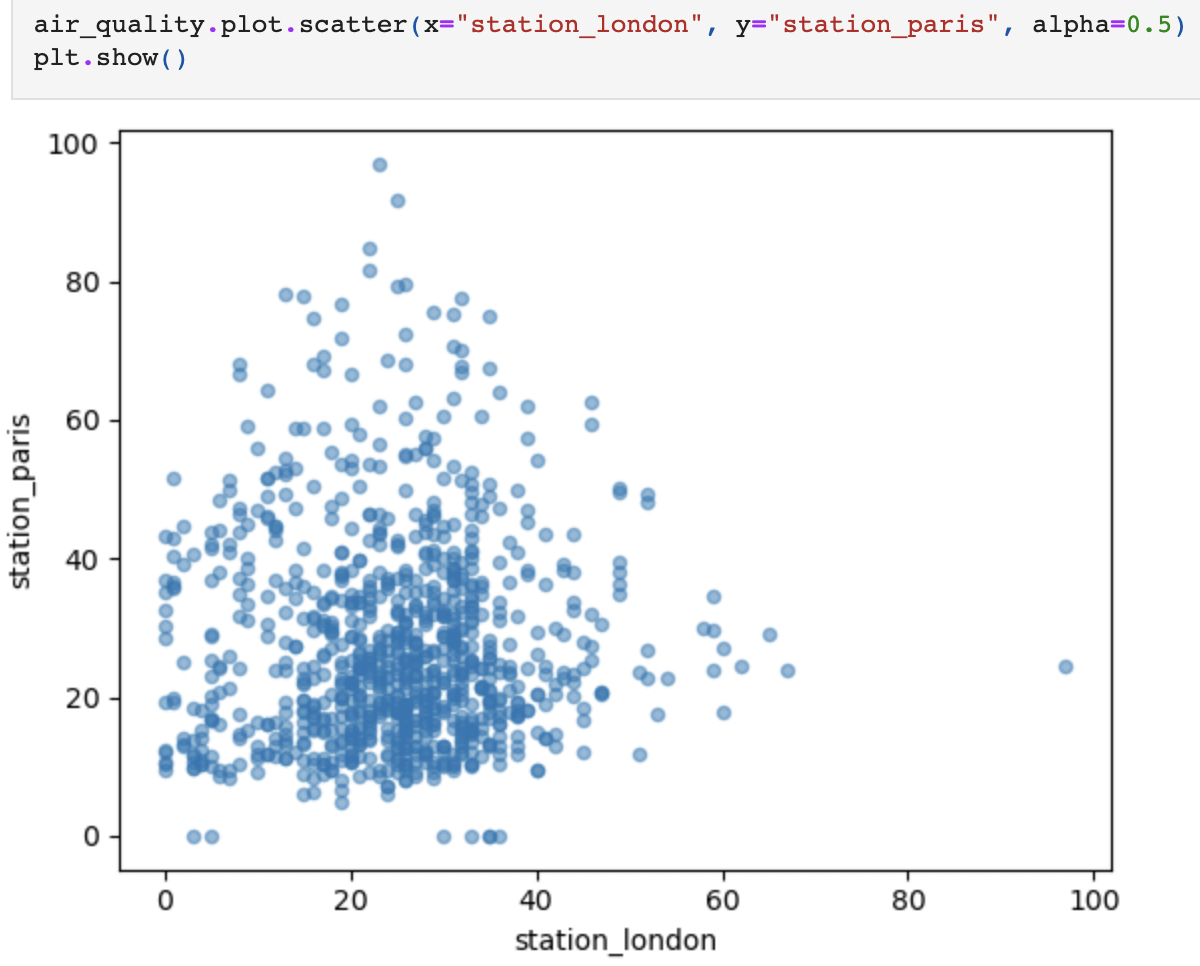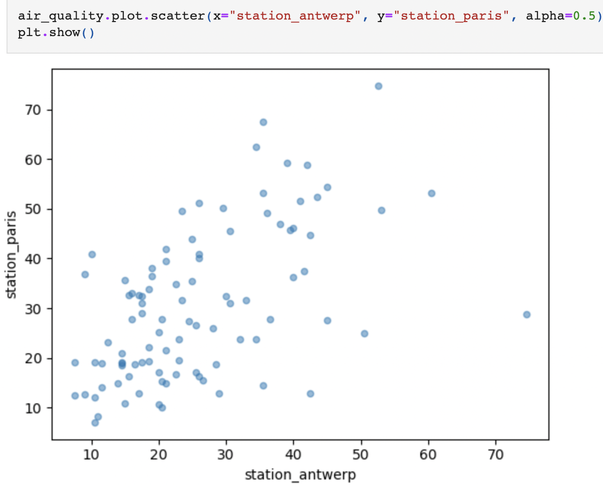 그러면 이제 x축은 station_antwerp 시리즈의 데이터, y축은 station_paris 시리즈의 데이터로 하는 산점도를 나타내는 것 또한 쉽게 할 수 있을 것이다.