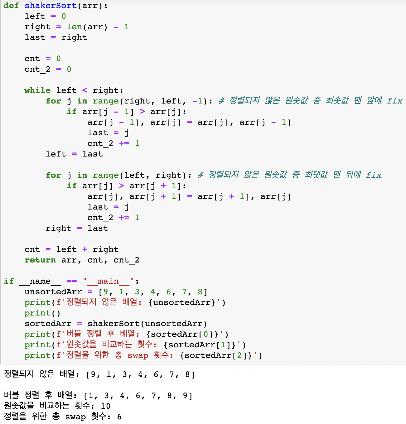 위 배열도 버블 정렬을 수행했을 때와 셰이커 정렬을 수행했을 경우의 차이를 파이썬으로 실습한 결과를 통해 살펴보자.