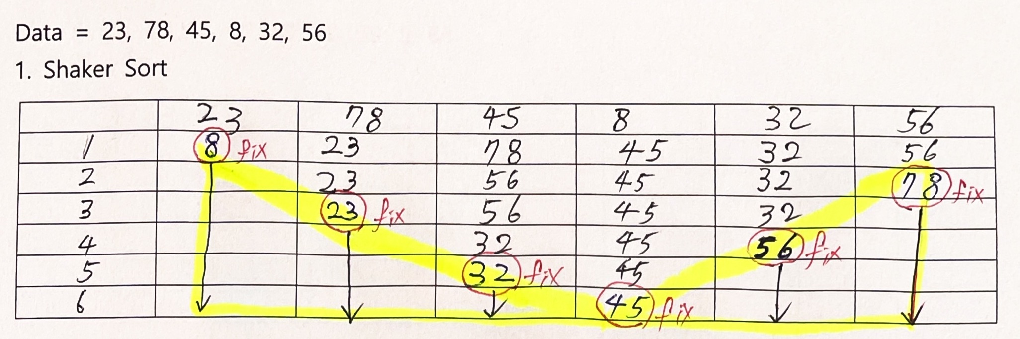 임의의 배열 [23, 78, 45, 8, 32, 56]를 셰이커 정렬로 손 로직도 한번 돌려보면 아래와 같이 나타낼 수 있다.