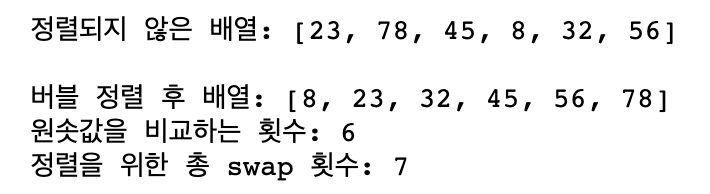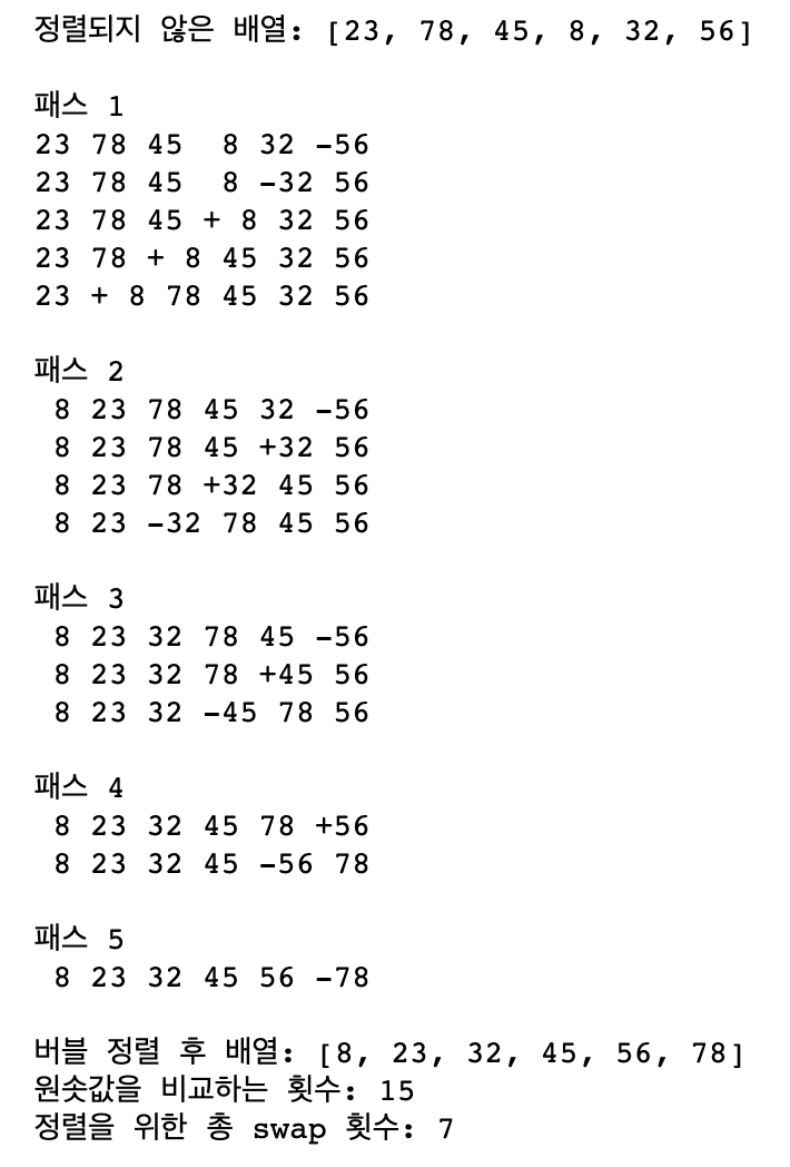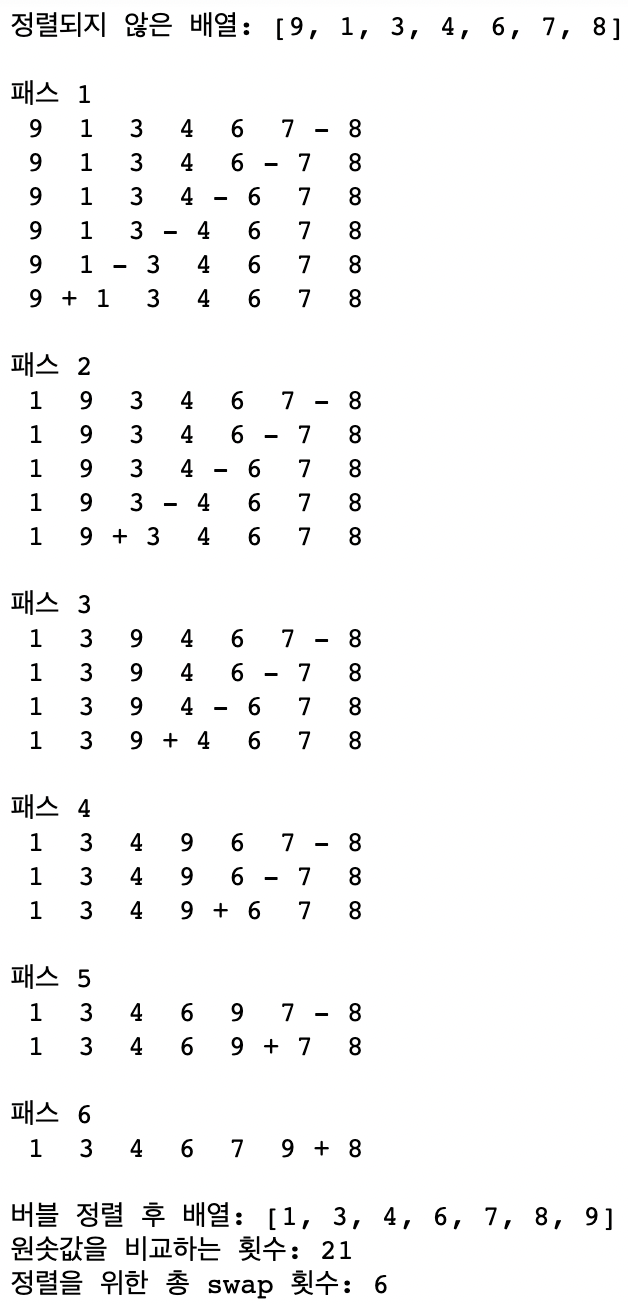 원솟값을 거의 정렬한 듯이 입력된 배열이지만 위의 실행 결과를 보면 원솟값을 총 21번 비교하고 교환은 6번을 진행하는 것으로 보아, 정렬 작업을 빠르게 마칠 수가 없다는 것을 확인할 수 있다.