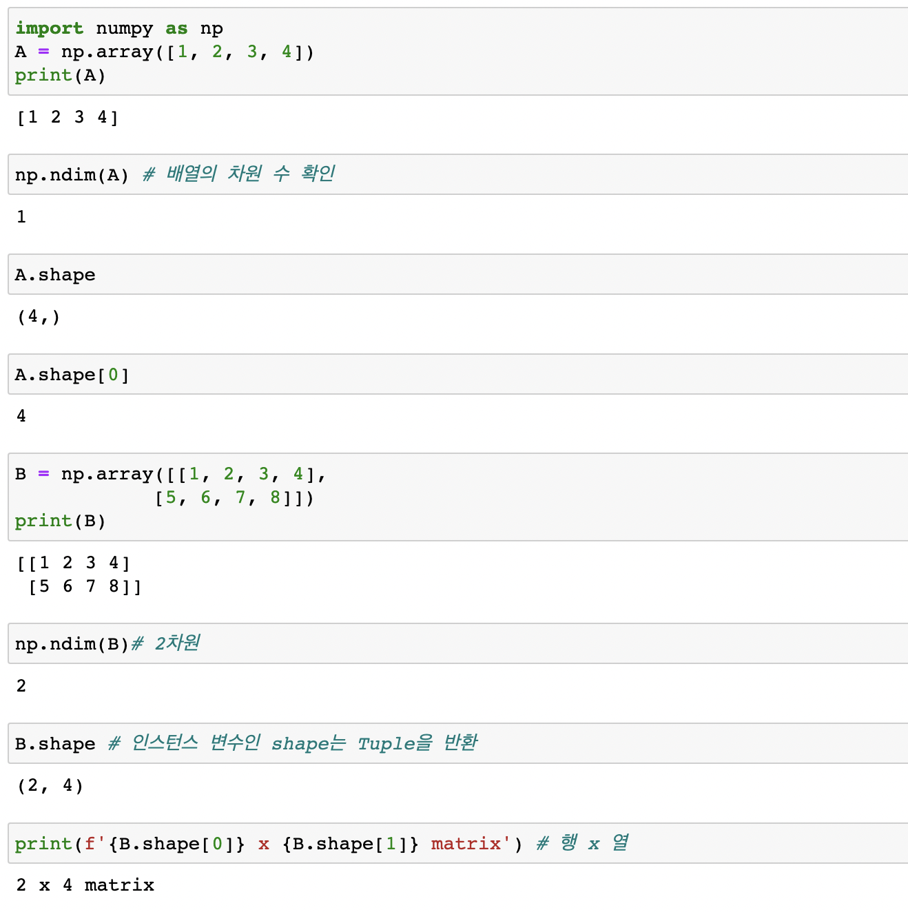 배열의 차원 수는 np.ndim() 함수로 확인할 수 있고, 배열의 크기는 인스턴스 변수인 shape로 알 수 있다.