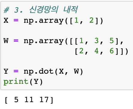 다차원 배열의 내적을 구해주는 np.dot() 함수를 사용하면 쉽게 내적을 계산할 수 있다.