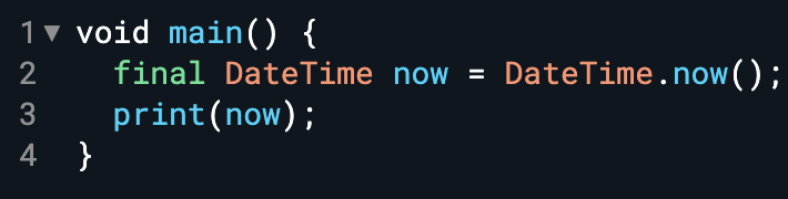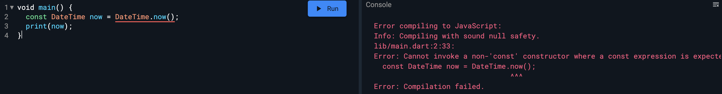 반면에 아래와 같이 const를 사용하면 에러가 출력된다. 왜냐하면 const로 지정한 변수는 코드를 실행하기 전에 값을 알 수 있어야 하는데 DateTime.now() 함수는 코드를 실행하고 난 후에야 알 수 있기 때문이다.