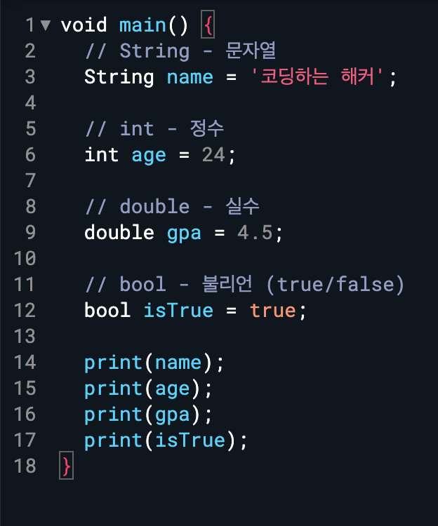 필자는 Flutter 학습을 위해 dart 언어의 문법을 학습하고자 한다. 이번 포스팅은 그 중에서도 기초 문법에 해당하는 부분에 대한 학습을 진행할 것이다.