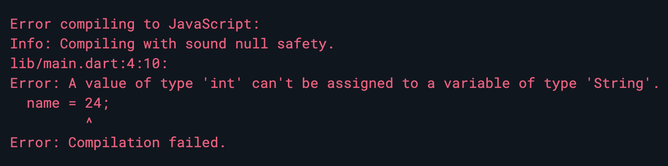 다만, dart 언어의 경우 print() 함수 끝에 세미콜론(;)을 꼭 해줘야 작동한다. 만약 세미콜론을 빼먹으면 에러가 출력된다.