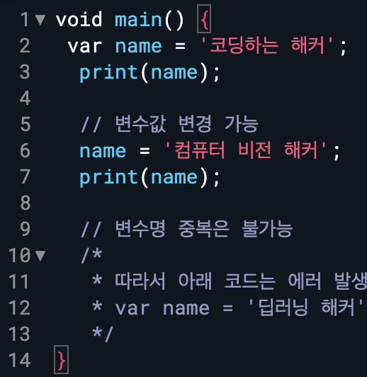 다트에서도 변수에 값이 들어가면 자동으로 타입을 추론하는 타입 추론 기능을 제공하므로 파이썬과 동일하게 명시적으로 데이터 타입을 선언하지 않아도 된다.