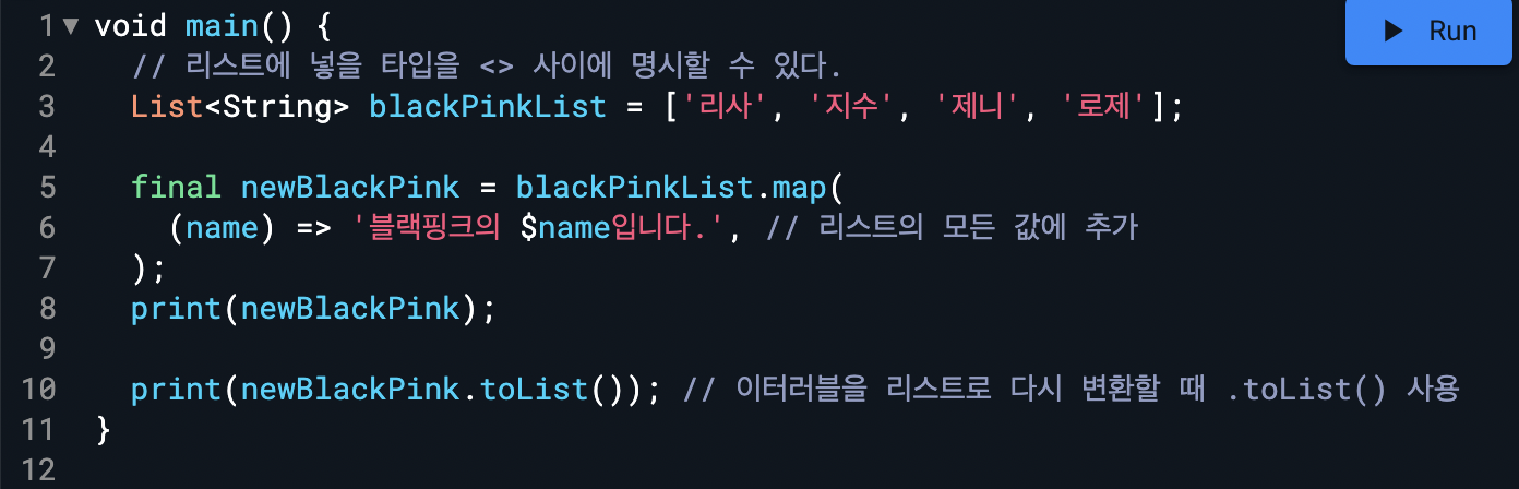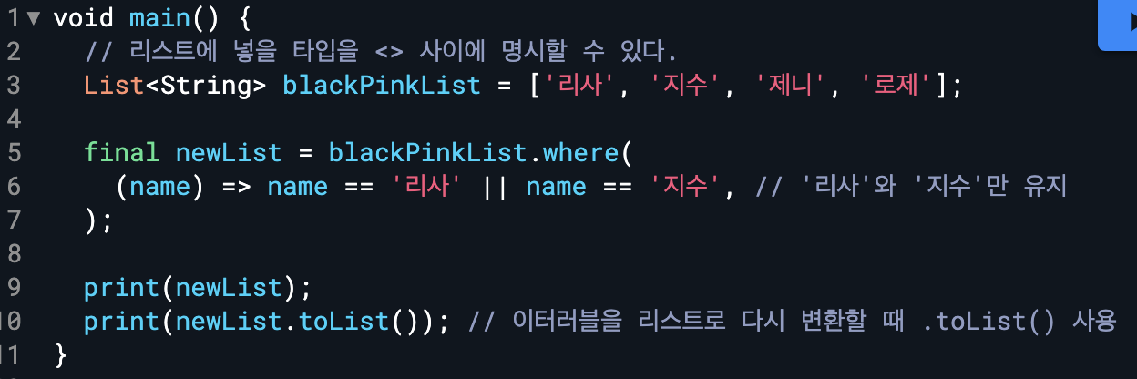 - 이터러블은 추상 클래스로 List나 Set 등의 컬렉션 타입들이 상속받는 클래스다. 쉽게 말하면 List와 Set 같은 컬렉션이 공통으로 사용하는 기능을 정의해둔 클래스로 where()나 map() 등 순서가 있는 값들을 반환할 때 사용한다.