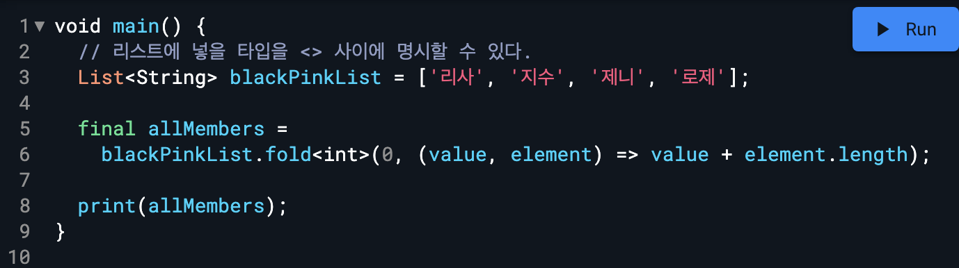 다만, 첫 번째 순회 때 리스트의 첫 번째 값이 아닌 fold() 함수의 첫 번째 매개변수에 입력된 값이 초깃값으로 사용된다.