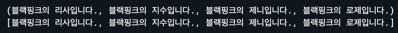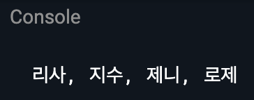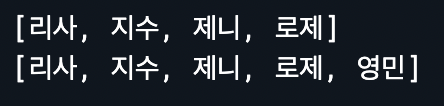 기존 함수들과 다르게 reduce() 함수는 매개변수로 함수를 입력받고 해당 함수는 매개변수 2개를 입력받는다. 순회가 처음 시작될 때 첫 번째 매개변수는 리스트의 첫 번째 값인 '리사'를 받게 되고 두 번째 매개변수는 '지수'를 받게 된다. 첫 번째 순회 이후로는 첫 번째 매개변수에 기존 순회에서 반환된 값이 첫 번째 매개변수에 입력되고 리스트에서의 다음 값이(제니) 두 번째 매개변수에 입력된다.