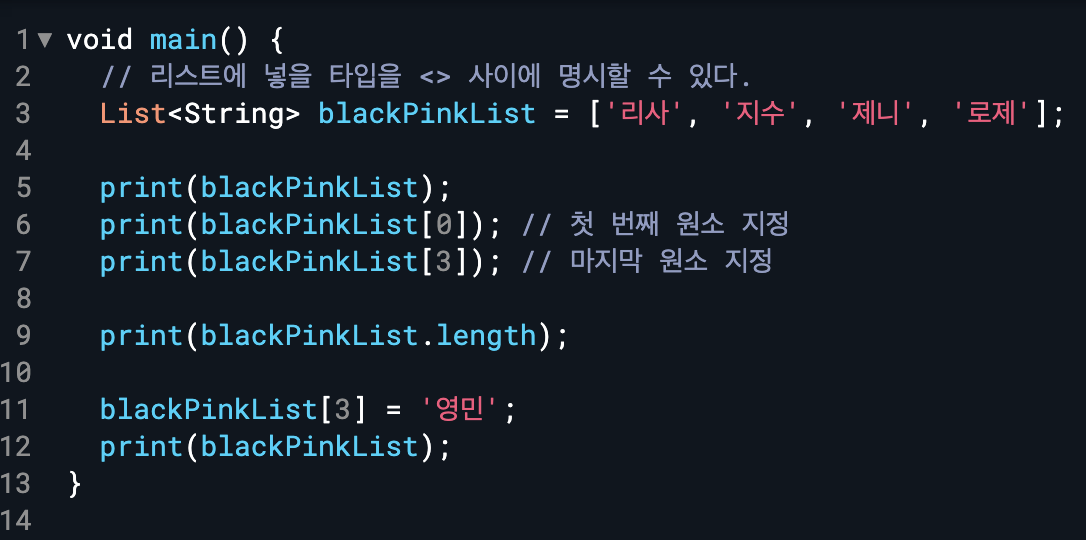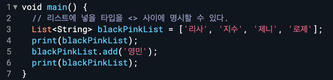 List를 선언할 때는 List <데이터 타입> 리스트명 = [값, 값, 값, ...] 과 같은 형식으로 선언한다.