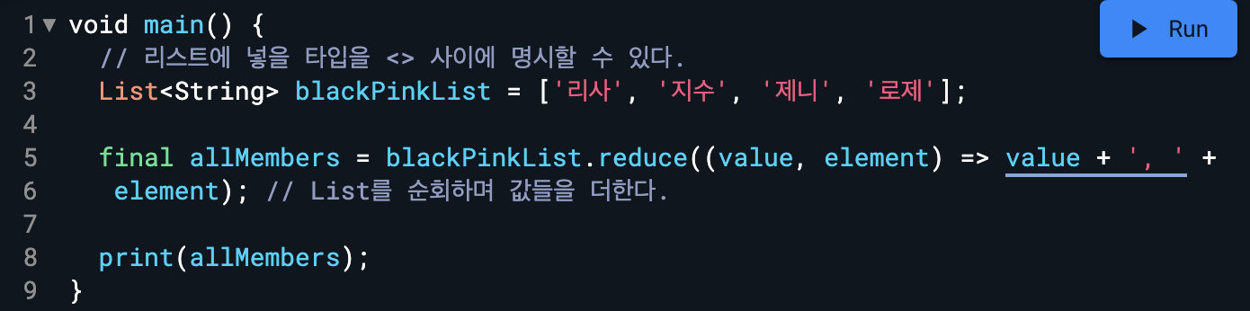 앞서 배운 함수들은 모두 이터러블을 반환했지만 reduce() 함수는 Lists 멤버의 타입과 같은 타입을 반환한다.